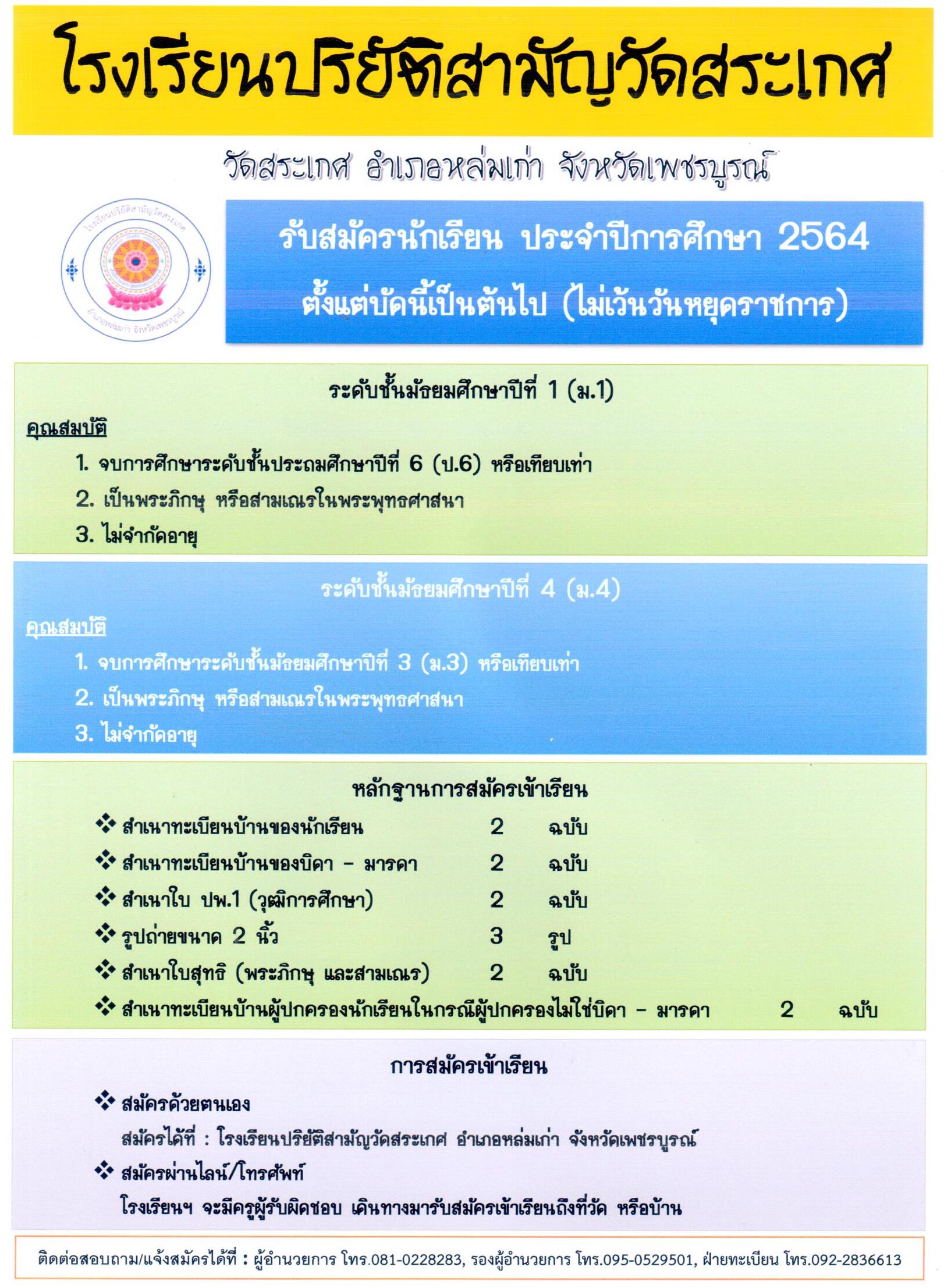 ประกาศรับสมัครนักเรียน ประจำปีการศึกษา 2564