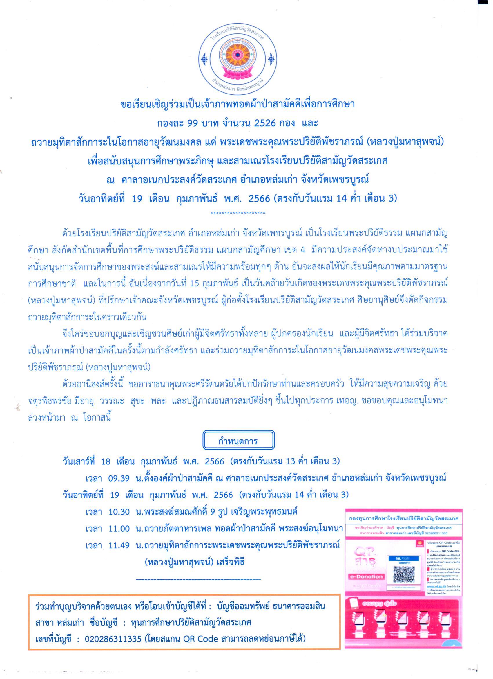 ขอเรียนเชิญร่วมเป็นเจ้าภาพทอดผ้าป่าสามัคคีเพื่อการศึกษา